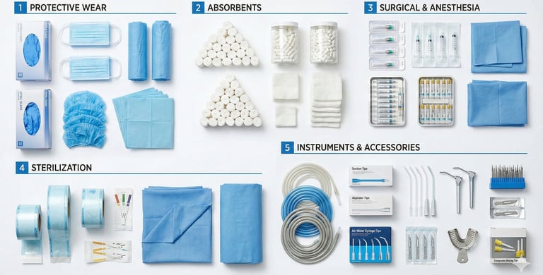 We supply high-quality consumables used in daily procedures, including gloves, gauze, cotton rolls, masks, suction tips, and sterilization materials.